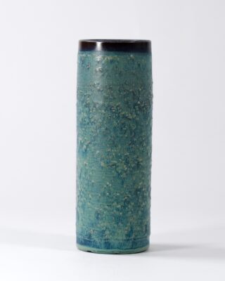Elegancki wazon o gruszkowatym kształcie, zaprojektowany przez Carla Fischera – uznanego niemieckiego projektanta ceramiki związanego z PGH Bürgel. Obiekt wykonany z kamionki z charakterystycznymi poziomymi liniami. Matowe szkliwo z delikatną teksturą nadaje przedmiotowi surowej elegancji i podkreśla jego modernistyczny charakter.